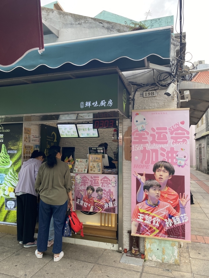 在澳门的街头巷尾,能感受到浓厚的全运氛围:巴士电子屏滚动播放活动宣传,官也街、大三巴等热门景区频现“喜洋洋”和“乐融融”的身影;还有店铺挂出“庆祝全运会开幕,进店消费低至1元”的横幅。官也街附近一家葡国菜餐厅老板告诉记者,“最近每天预约爆满,不少是来看全运会的内地游客”。
